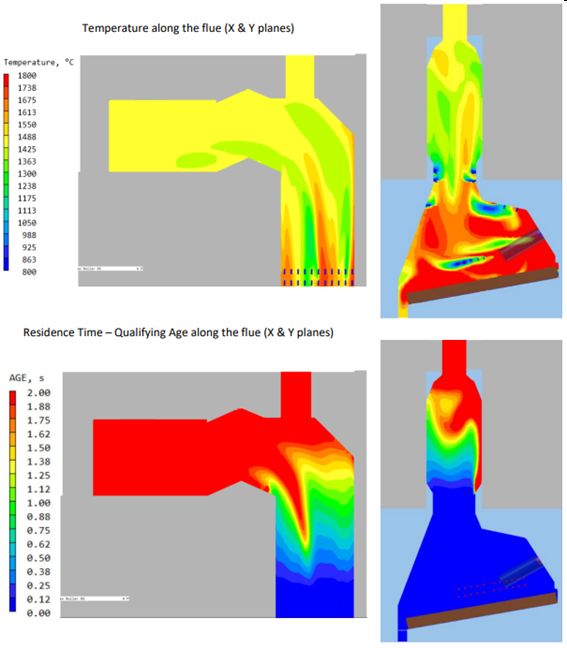 CFDの結果は、適格ゾーン全体の最低ガス温度が目標値を満たしているか超えていることを示しています。同様に、結果は、燃焼室の提案された設計の動作試験が、廃棄物セクターガイダンスノートEPR5.01の焼却で推奨されている滞留時間と温度の目標を満たしているか超えるであろうことを確認しました。