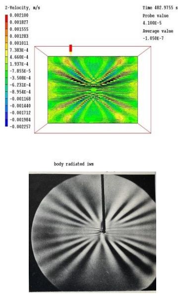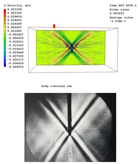 図1 上の図は、均一に成層した流体内で周波数N/sqrt(2)で垂直方向に振動する中心物体のPHOENICS速度ベクトルと垂直方向の速度等高線を示しています。下は同等の実験結果です(Ref 1 p314、図76より引用、写真はD. H. Mowbrayによる)