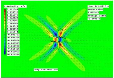 図2. 均一成層流体内で周波数N/sqrt(2)で垂直方向に振動する中心物体のPHOENICS速度ベクトルと垂直速度の等高線。変位と位相の影響を示すために垂直速度の等高線が示されています(ケース2)