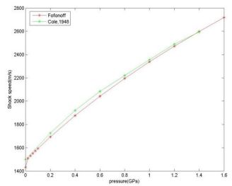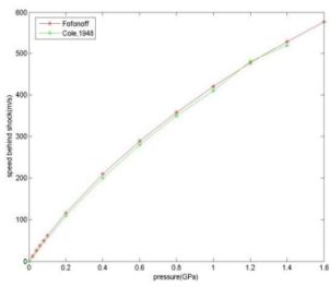 特に、衝撃波を横切る圧力ジャンプの範囲を指定することにより、上記の関係を使用して衝撃 U と流量 μm 速度を pm の関数として決定できます。これらの結果を参考文献 4 の結果と比較することでチェックできます。Fofonoff の式を使用した場合を図 1に示します。ここで非常に良好な一致を示しています(Tait 式でも同様の結果が得られます)。