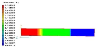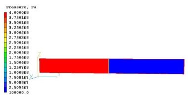 図2−1に示す最も単純なケースでPHOENICSで計算しました。初期条件として長さ 200 m のチューブの左側の高圧水 (4x108 Pa)と右側の低圧水 (105 Pa) に分離しておきます。また両側とも初期水温は同じ14℃であると仮定しました。この初期状態から非定常計算を開始します。これにより、衝撃波が右に進み、膨張波が左に進む典型的なショックチューブの流れが生じます。これは、PHOENICS によって 時間依存性を持つ1次元圧縮性流れとして計算されます。ここで、PHOENICSは圧力の関数として定義される密度とともに質量運動量とエネルギーの保存方程式を解きます。