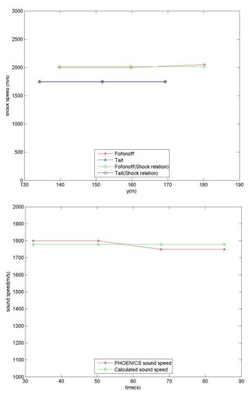 図 4: 衝撃波(上)と膨張波(下)の速度とPHOENICSから計算された速度の比較