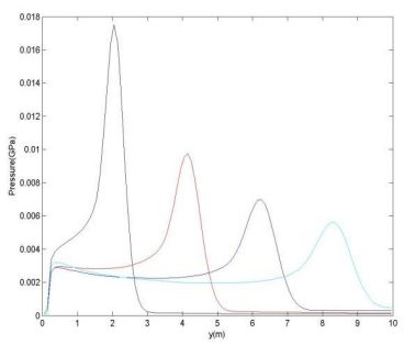 図3は、シミュレーション中の各時刻の圧力分布を示しています。これらのプロットから、衝撃速度と膨張波 (局所音速で伝わる) の速度を計算できます。これらの値は、上記の方程式から計算された値と比較できます。図 4 は、FofonoffとTaitの両方の密度関係式について非常に良好であることを示しています。