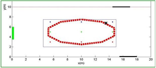 ドアの位置は緑色、窓は黒色で示されている。青色の四角形は歌手の位置、監視位置は赤、緑、青の点で示されている。感染者の位置は十字で示されており、赤い点線の軌跡は1200秒(20分間)の休憩中の感染者の動きを示している。