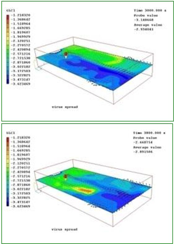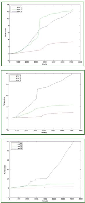 図3は、ハーフタイム休憩前3000秒(50分)と休憩中3800秒(63.33分)のCOVID濃度を示しています。COVID発生源は集団内を移動しながらウイルスを拡散させています。測定場所(図1参照)における時間経過に伴う正規化されたCOVID線量(線量)を図4に示します。予想通り、COVID発生源が長時間近い場所では、COVID線量が高くなることがわかります。また、窓から空気が出ている場合、開いた窓の近くにいることが必ずしも安全とは限らないことも興味深い点です。