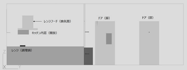 また、今回の研究目的は、PHOENICSを使用して(図1)に示すように、キッチンと隣接するリビングルーム等、典型的な住宅の配置モデルを作成し、”PM2.5濃度“の微粒子状物質をシミュレーションすることにより、調理中の室内空気汚染の可能な制御手段を調査することでした。