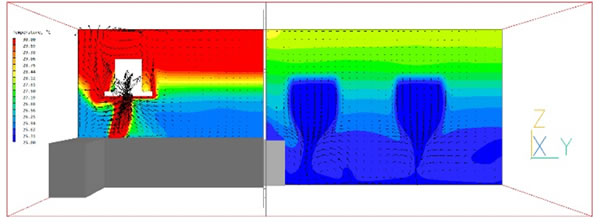 (図3)換気フードに沿った、X平面のキッチンとリビングルーム全体の温度等高線と速度ベクトル。