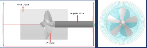 ”PHOENICS”で、プロペラ、プロペラシャフト、ROTORオブジェクトを円筒座標系の解析領域内に設定しました。