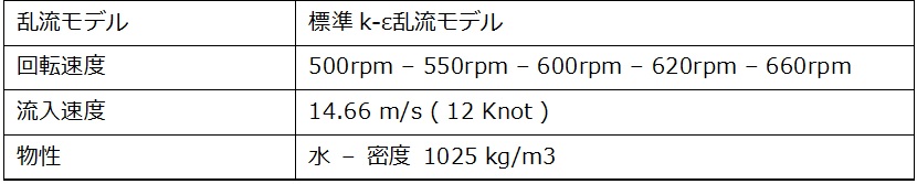 そして、ROTORオブジェクト(領域)内でプロペラが他の静止オブジェクトに対して移動(回転)できるようになります。 使用した乱流モデル、プロペラの回転速度と入口速度を表に示しました。