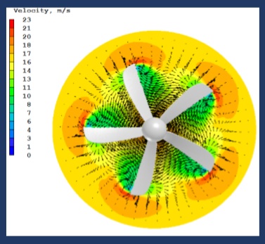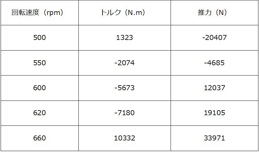 5つの異なる回転速度でプロペラのトルクと推力の値を計算しました。 各回転数における推力とトルクの結果を表に示しました。 最大速度は、”500rmp”のケースにおいて、プロペラ周りで”23m/s”となっています。