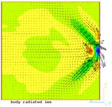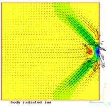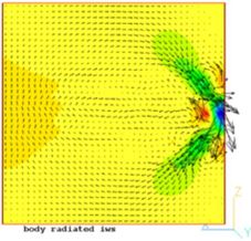 図4.二次の減衰:シミュレーションで図2bと同じ時刻の内部波ビームの速度ベクトルと速度コンタ等