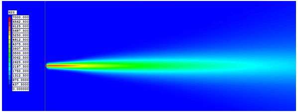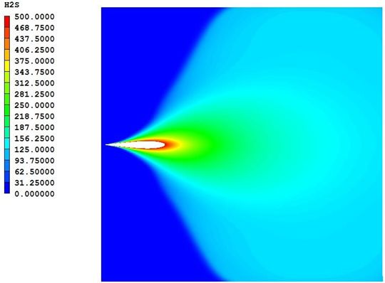 - 排出ガスは主にCO2であるため、物理的特性の観点から純粋な CO2 でモデル化されます。H2S のフィールド値は、排出ガスの局所的な質量分率から、発生源での混合組成を参照して推定されます。