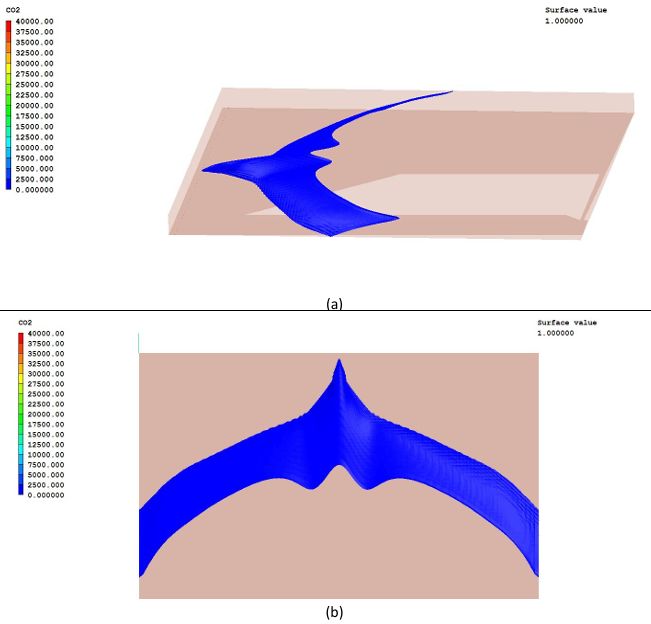 予想通り、汚染物質は主に地面と平行に広がります。汚染物質が地面を包み込む傾向があることを示すために、1ppm CO2 等値面を図 15 (a + b) に示します。