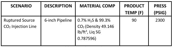 この実証計算は、超臨界CO2を輸送する注入ラインから破裂した際のガス放出と、それに伴う大気中へのガス拡散のモデル化に関するものです。主な目的は、特定の濃度レベルで放出されるガスの終点距離を予測することです。この研究は、テキサス州ヒューストンの Occidental Oil & Gas Corporation の依頼で実施されました。