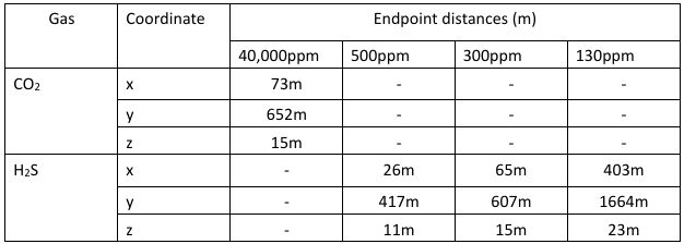 製品には少量のH2Sも含まれていることがわかります。要件は、Fクラス安定度、風速 1.5mph (0.671m/s)、周囲温度 70F (294.1 K) という気象条件下で、CO2 の場合は 40,000 ppm、H2S の場合は 100、300、500 ppm での終端距離を予測することです。