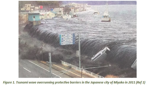 津波(fig 1)は、主に地震によって引き起こされるもので、UKには然程脅威ではないと考えられていた。しかし、より最近の研究(ref 1)により、大きいスケールの海中への地滑りが津波を引きおこす可能性をあるかもしれず、実際8200年前シェットランドではこれにより20mの津波を発生させていたことが分かった。リスクは低いかもしれないが、原子力や他の必須のサービス設備は、10000年に1回起こるかもしれない災害からも保護されるようにしなければならない。