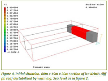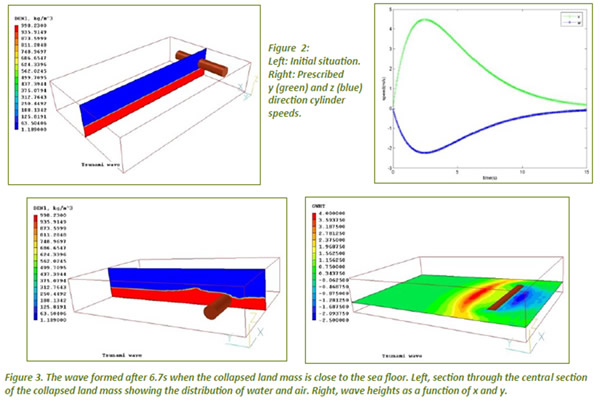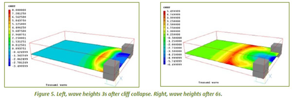 PHOENICSのSEM (同時にMOFORを使用)して、デブリが海中に崩落した場合の発生する波の形状をシミュレーションした。これらの方法は、波の影響が海のどれぐらい遠くまで届くよう伝播しているかを求めるモデルに対する入力条件として、初期の波構造を決定するために、興味深い具体的なケースに適応されるかもしれない。