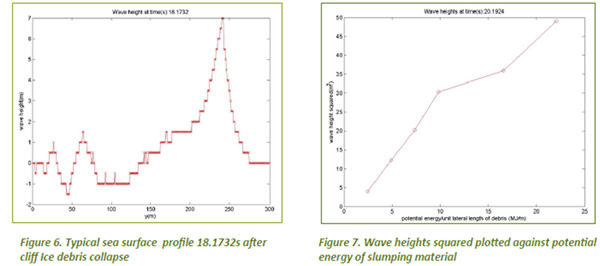 15m×20mの氷塊デブリの断崖は、暖められて不安定になり液体として(密度は海水)海へ崩落することを模擬している。崖の崩落による水面から上昇した高さは、3秒後と6秒後についてfig5に示す。8mと5.5mの高さの波が前縁に現れる。