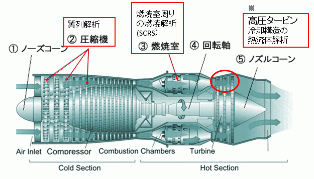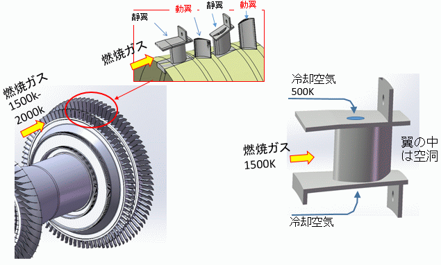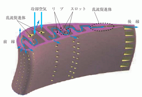 翼は燃焼ガスをまともに受けると素材が耐えられないため、高圧の冷却空気を注入することによって翼を冷やし、耐久性を確保する。また、翼にある小穴により冷却空気を外へ出し翼面を高温から守る。ただし、冷却翼の設計上難しい所冷却流量を増やすとタービン効率も下がるので、冷却流量を極力下げないといけない。