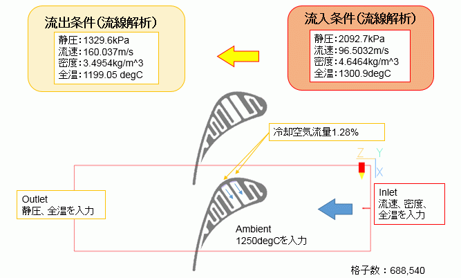 →冷却流量、小穴の配置を変更して解析を行い、翼表面、周囲の温度を求める。