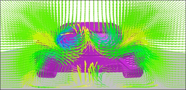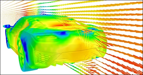 自動車の空力解析の例です。 ボディ形状を正確に表すために、形状に合わせて格子を作成する(非構造格子)のではなく、 格子中に形状を置くと、一つ一つの格子が自分で固体か流体か、又は混在かを判断する。 これによりボディ周りは詳細メッシュ、 離れた領域は粗いメッシュとメッシュを効果的に割り振ることができます。