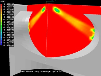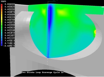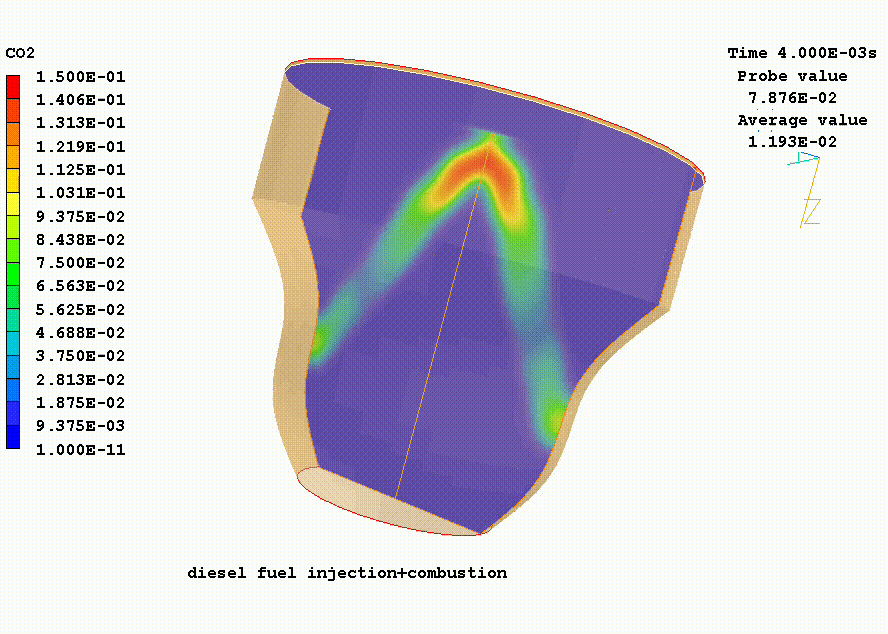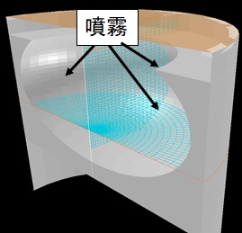 ディーゼルエンジンのシリンダー内でインジェクターから噴射される燃料液滴の軌跡を計算した。 2相流パッケージの粒子追跡計算モジュールGENTRAを 使用している。