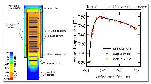 炉内には3個の加熱コイルによって外部から加熱される石英管が設けられており、それぞれのコイルの発熱量はチューブの中に位置した熱電対によって制御されます。熱電対の測定結果から、熱損失を補うために上部755C、中央770C、下部765Cなる分布を持つものとして設定します。石英チューブ内には71段のシリコン・ウエハー(直径150mm、間隔8mm)がバッチ形式で設置され、3個のクォーツバッフルが、ウエハーから低温の下部フランジへ放熱するのを防ぎます。 ウエハーバッチの中心では一定な温度勾配を持っているが、surface to surface輻射モデルにて半透明な輻射率を考慮したシミュレーションにおいて同様な結果が得られた。