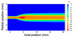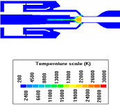 多くの工業装置においては、強力な熱源として、高圧プラズマが利用されています。例えばアーク炉、torches、ヒータ、溶接装置などの装置でものを溶解したり、切ったり、加熱したり、廃物処理、表面加工などが行われます。特に最近Carbon Nanotubes製造プロセスはかなり大きなエネルギー源が必要です。熱プラズマはプラズマ成分(電子、イオン、原子と分子)と同じ温度と考えていい。通常は20,000K-30,000Kの高温である。そのような流れでは、高温、乱流、輻射熱が非常に大きいなどの特徴があります。一方、マイクロウェーブからのプラズマ生成については、外部からのエネルギー源は非常に小さい領域に伝えるので、電子から重い粒子への伝達が遅く、温度が一致すると考えることができません。そのため、二温度モデルが必要になります。高圧プラズマ装置の開発においては、実験とスケール化に非常にお金がかかりますので、数値計算は開発のツールとしてよく使用されています。3次元流体解析ソフトPHOENICSはhigh power circuit breakers and a microwave genarated plasma jetの数値解析に 使用され、非常に強力なツールであることが証明されました。