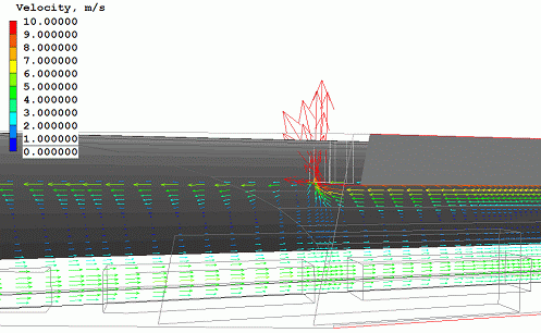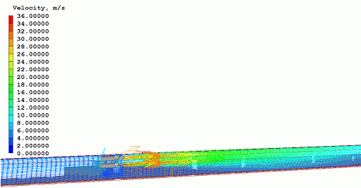 ファンで与えている速度は、臨界速度より大きくしています。(臨界速度は、火の上流側に煙が流れてこない最小の速度です) |