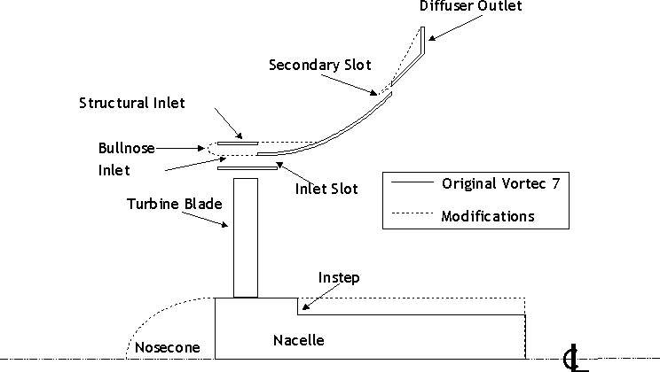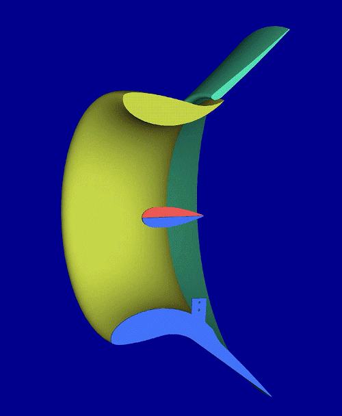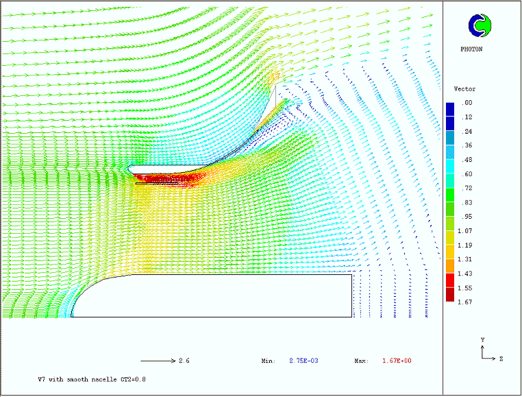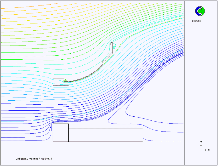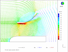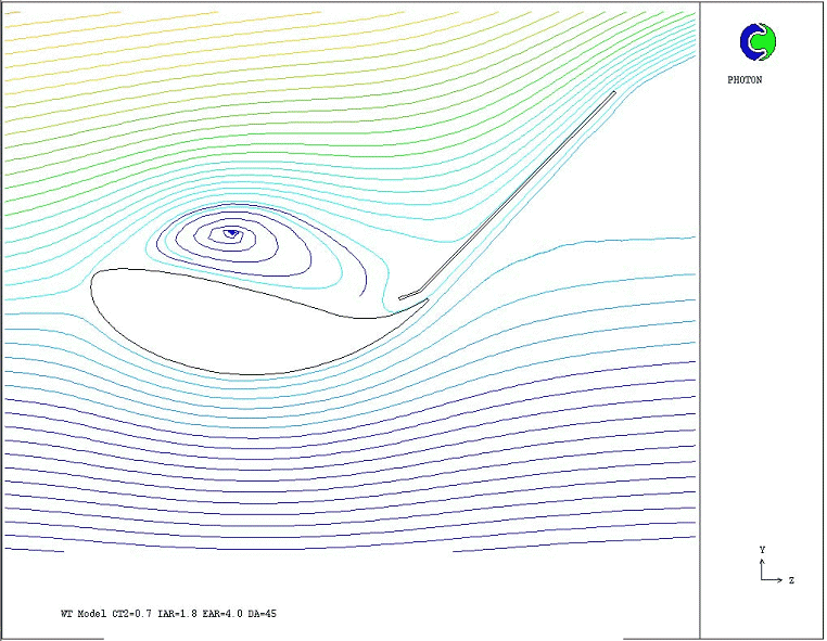 DAWT(ディフューザー増強式風車)の計算をしています。DAWTとは風車の周りにディフューザと呼ばれる囲いを付け、その効果により風車に当たる風を少しでも 増やそうというものです。 この計算ではDAWTシステムの改善前と改善後の計算を行い、流線図とベクトル図で示している他、風洞実験との比較をグラフで示しています。