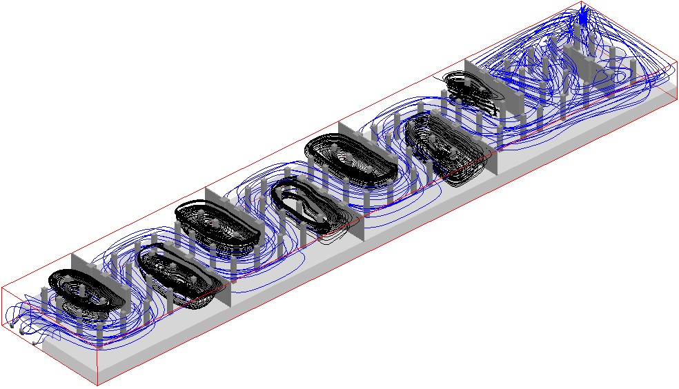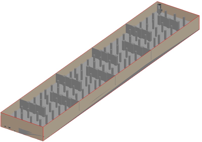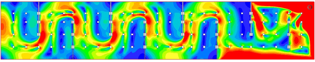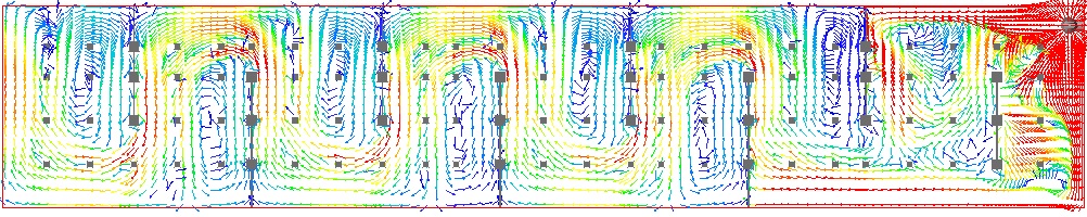 ◎解析条件 1.境界条件 流入条件: 1450[m3/h] 流出条件: 相対圧力を0Pa 壁面条件: No-Slip 条件(解析領域上面のみSlip 条件) 2.物性値 水(16℃):密度 998.92 [kg/ m3] / 動粘度 1.1188E-6 [m2/s]