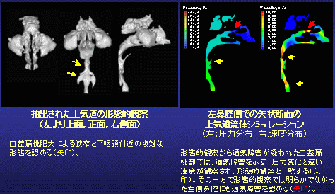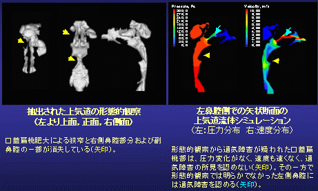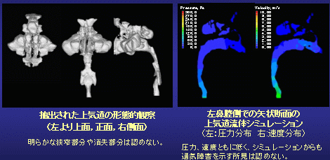 ・これまで上気道の通気障害について鼻腔通気度計やpolysomnographyなどの機能検査やMRI、CT、側面頭部エックス線規格写真などの形態検査が行われているが、通気障害の部位を特定する検査方法は確立されているとはいえない。 そこで上気道通気障害部位の特定方法として上気道流体シミュレーションの有効性を検討し、臨床応用の可能性を検討する