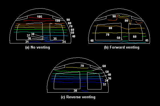 (a)は空調なし、(b)は標準(上から下)、(c)は逆流(下から上)の場合 |