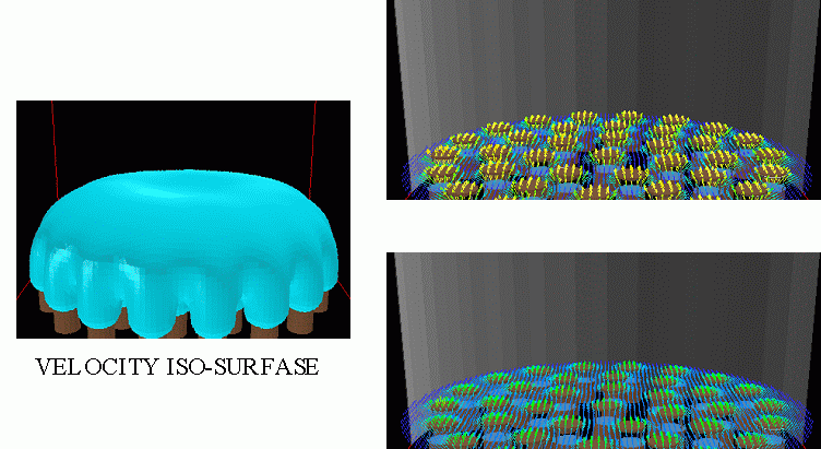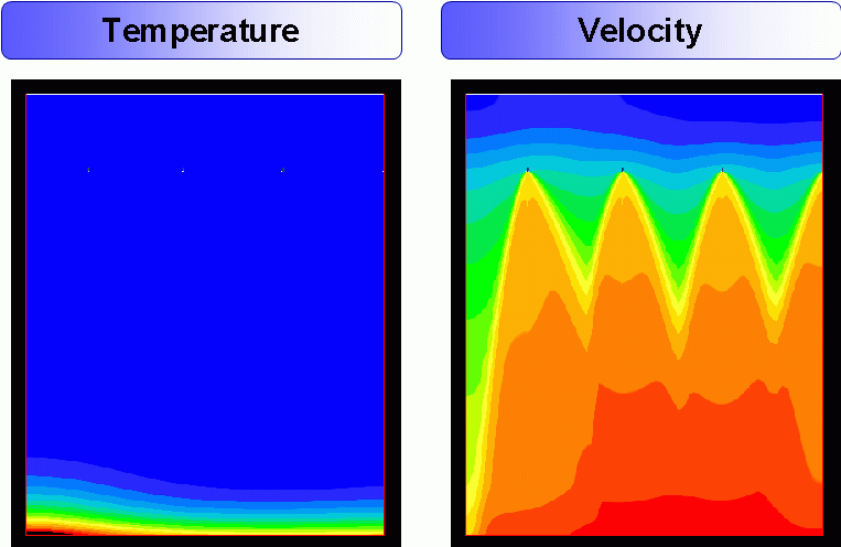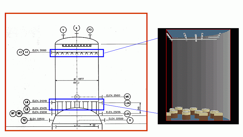 石油精製装置の一種である減圧蒸留塔において(蒸留用充填物のない)熱伝達領域の解析を行いました。この領域で噴霧による伝熱を利用することで圧力損失が減少し、軽油供給率の増加を図ることができます。