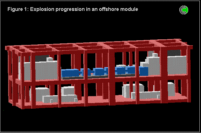 北海油田の石油掘削プラットホーム上の構造物内での爆発の計算です。 閉空間における拡散火炎問題で、ガスの濃度変動は多流体モデルを使用 して非定常計算で解いています。 画面で示されているのは火炎面の時間変化を表したアニメーションです。