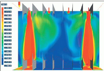 このようなタンク内の流れ場を計算、可視化して大規模混合換気を駆動するメカニズムを理解するためにPHOENICSを使用しました。