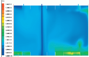 本計算ではタンク天井面にφ318の換気孔が空いていてそこを通して換気が行われます。定常状態のシミュレーションは、主噴流から離れた区画の重いガス蒸気の除去が難しいことを示しています。