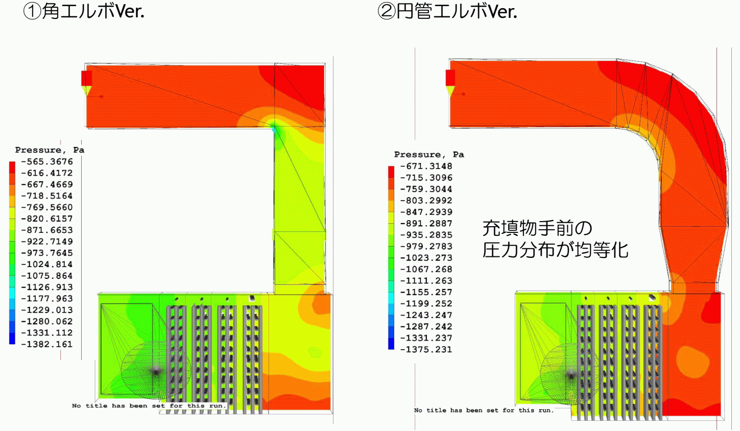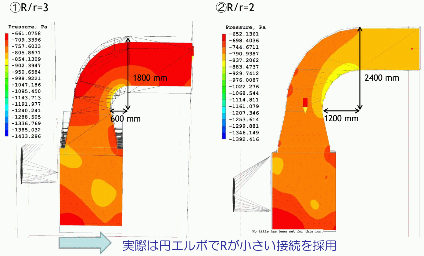 数値計算により、角エルボと円管エルボの違い、エルボの湾曲度合いなどについて調べた。比較図を図5(a),(b)に示す。