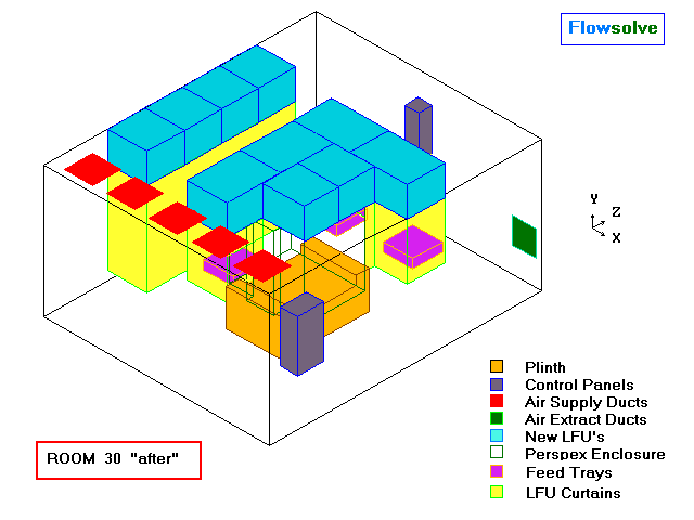 トップページ > 熱流体事例 > 機能別及び検証事例> 乱流事例> 製薬の"クリーン・ルーム"における空気流れ分布解析 |