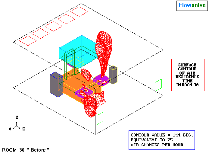 三つのケース(但し、示した結果はRoom30のみ)でLFUの設定場所により工作室での空気流れ解析結果を比較し、特に空気のある場所における"停留時間"概念を加えて、複雑な換気フローの評価に役立ちます。本研究においては解析結果の評価を中心とされ、実験には触れていません。 |
