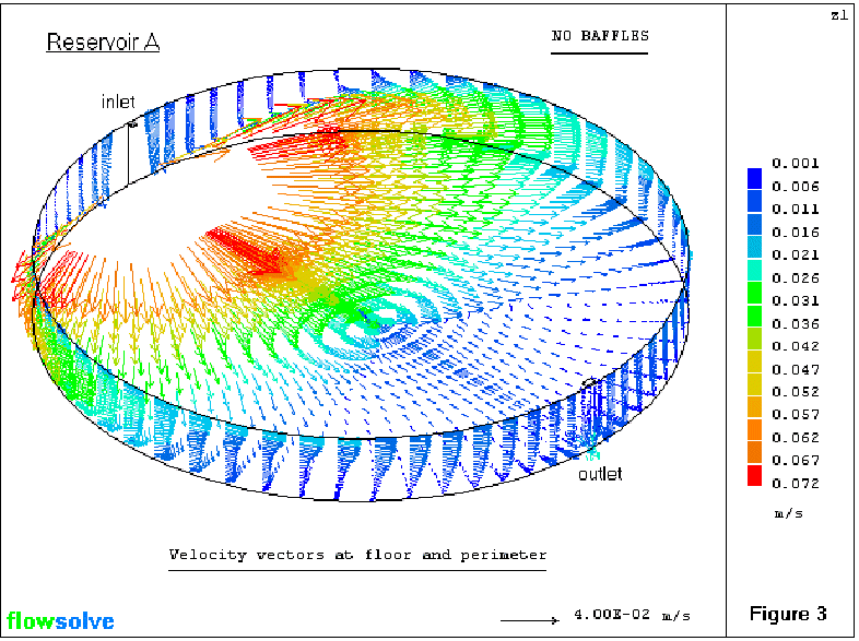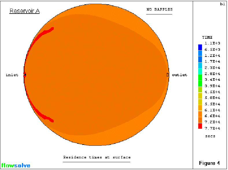 概要:2つの飲水貯水槽(直径×高さ:35m×4.1mと30.6m×4.65m)を対象にしてのCFD解析で、淀み区と”short-circuit”領域を短縮し、設計を改善しました。解析中、水の槽内底流時間も解いています。円柱形、GCV、UMISTスキーム、乱流