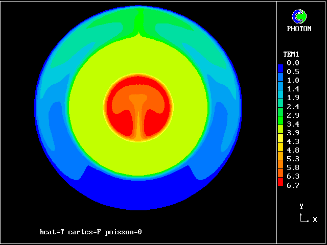 中心に高温、周囲が低温で流れる熱交換器が水平に設置されている。低温側の液は内壁面で加熱され上部中央から上昇し天井から下降する。逆に高温側は壁面で冷却され壁面に沿って下降し底部中央から上昇する。この時の固体にX方向、Y方向にそれぞれ温度差による熱応力が発生する。応力によって生じた歪みの分布は以下のようになる。